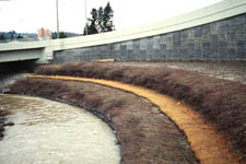 Objectives: Relocate and stabilize a stream channel and associated cut and fill banks. Restore aquatic and riparian habitat, and water quality lost during the construction of a new bridge and interchange.