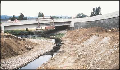 Robbin B. Sotir & Associates, Inc. (RBSA) was retained by ODOT to evaluate the proposed channel design for stability and for potential impacts to aquatic and riparian ecosystems and to modify the design as needed to address the concerns voiced by the Johnson Creek Corridor Committee. The review determined that the proposed trapezoidal channel cross-section shape and gradient were too uniform and that the floodplain berms were too high. RBSA recommended changes to the channel to improve stability, water quality, and habitat value (Sotir and Nunnally, 1995). The channel cross-section was altered by lowering flood plain berms, incorporating a sub-channel sized to convey bankfull flows, and constructing a low flow channel to concentrate flows during the summer months. A pool-riffle sequence was created by widening the sub-channel and raising the invert by one foot (1') in cross-over reaches and by lowering the invert by one foot (1') in outside meander sections.