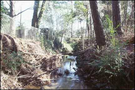 This stretch of Long Leaf Creek is located in a residential neighborhood known as Long Leaf Hills Subdivision. The project reach starts upstream from Shipyard Boulevard and ends at the confluence of Hewlett's Creek. Streams in the Wilmington area, including Long Leaf Creek, have been altered by accepting increased stormwater runoff due to urbanization of the watershed. The stream floods frequently in the lower section. This increased flooding and high peak discharges have caused significant bank erosion and channel enlargement. The channel has become both deeper and wider. Compounding the increased stormwater problem is bank seepage and uncontrolled overbank runoff, which also contributes to bank failure. Finally, the creek has been used as a dump-site for organic garden debris which kills the bank vegetation and is exasperating erosional failures. These mechanical, hydrologic, and hydraulic problems have caused degradation of the aesthetic and riparian corridor values in the creek. Public meetings illuminated the desirable past conditions of the creek, the concerns of the existing conditions and their interest for stabilization and restoration in terms of how they wanted to use and enjoy their creek in the future. See Figures 7 and 8.