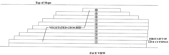As shown in Figure 3, the secondary geogrid, burlap, and brushlayers (which together constitute the vegetated geogrid) were primarily designed to provide facial stability to the slope. As shown in Figure 2, the secondary geogrid and burlap "wrap" the face of each vertical lift between each row of brushlayer branches. The burlap temporarily prevents soil from sloughing out the face through the grid openings until the plant materials produce leaves and roots. The face wrap extends .91 meters (3 feet) into the slope at the bottom of each vertical lift and 1.52 meters (5 feet) at the top. All lifts were constructed using a continuous batter board to control the slope of the face. A front view of the vertical and lateral limits of the vegetated geogrid lifts and brushlayers is provided in Figure 4.