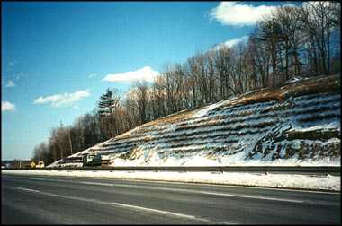 Drainage - The original design called for a continuous backslope drainage system to intercept groundwater before it enters the reinforced portion of the slope and divert it to the gravel subbase and drainage system beneath the slope. The back slope drainage system was originally designed to consist of free-draining crushed stone, with filter fabric against the naturally deposited glacial soils. However, since it was desirable to allow some water to migrate to the willow and dogwood branches in the slope, the design was modified to utilize 1.52 meters (5 feet) wide prefabricated drainage strips spaced 4.57 meters (15 feet) on center in place of the continuous crushed-stone backslope layer. That allows some groundwater to migrate into the reinforced zone without permitting hydrostatic pressures to develop on the back side of this zone. The brushlayers also function as horizontal drains, reducing the possibility of hydrostatic pressures.