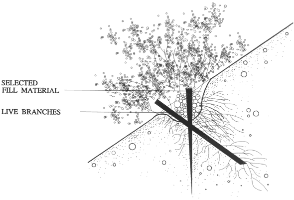 Brushlayers consisting of 2.44 to 3.05 meters (8 to 10 feet) long willow (salix sp.) and dogwood (cornus sp.) branches were placed on the constructed earthen terraces between each .91 meters (3 feet) vertical lift. These brushlayers, which are installed in layers with the growing ends exposed, extend from the face approximately 3.05 meters (10 feet) back to the mid-point of the slope. During the growing season, these brushlayers will root and produce leaves, stabilizing the face of the slope. They will also provide some measure of internal stability initially and over the long term. The alternating sequence of constructed earthen terraces and live branch brushlayers is shown in Figure 5.