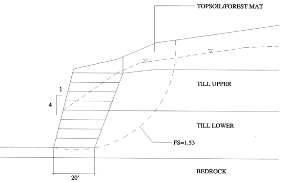 Subsurface conditions at the site include widely graded, slightly cohesive, dense to very dense glacial till overlain by shallow surficial topsoil and forest mat. Bedrock is typically located within 3.05 meters (10 feet) of the base elevation of the slope. However, during construction an outcrop of poor rock was discovered along a 7.62 meter-long (25 feet) section of the slope. The rock sloped unfavorably toward the roadway and required controlled blasting to cut it to a stable surface on which the slope could be reconstructed.